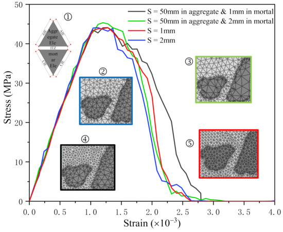 Furthermore, the curve of the element size divided into 50 mm in aggregate and 2 mm in mortar (green curve) is not much different from the curve with the element size of 1 mm (red curve). Compared with the curve of element size divided into 50 mm in aggregate and 1 mm in mortar (black curve), those two curves are smoother, the fluctuation range is smaller, and the convergence is better.