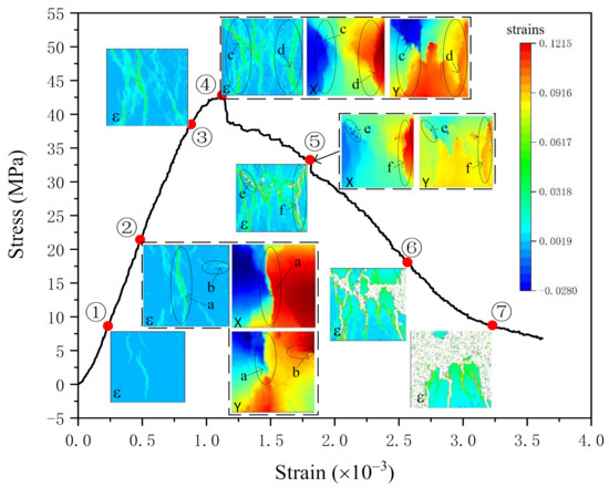 When the stress reaches 50% of the peak stress (Figure 8➁), the cracks that existed in point 1 are connected to form the first through crack (crack a) on the surface of the specimen. Then the fracture behaviour of crack a is analyzed through displacement contours. The colour of the x-direction displacement contour changes abruptly on both sides of the arrow, which means the crack exists at this place [45,46]. The shape and position of this crack are consistent with crack a. Also, a sudden change in colour takes place at the top of y-direction displacement contour (marked by the circle), the shape of it is obviously the same as the upper part of crack a. In total, the displacement contours indicate that the fracture behaviour of the upper part on crack a is shearing while the lower part is opening.