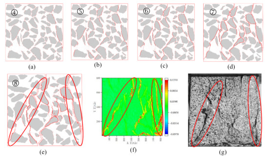 Before peak point, the stress increases with the increase of strain, up to the stress reaches 75% of the peak value, there are some cracks in the strain contour, and these cracks exist at the interface of aggregate and mortar (Figure 9➂). However, the stress contour shows that the stress distribution is uniform and there is no failure element.