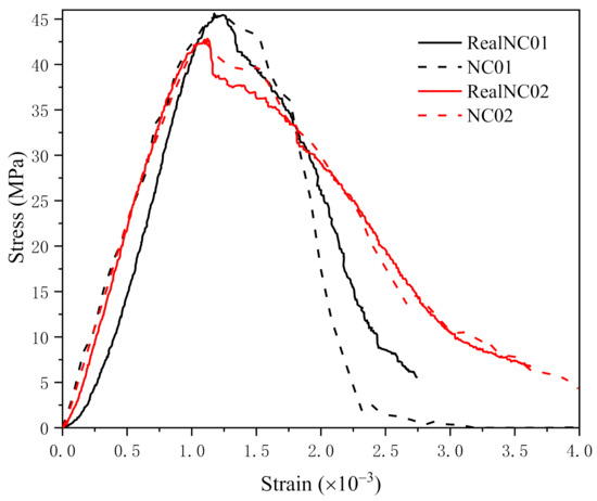 The simulated strain ratio curve shows when the strain exceeds 0.0005, micro-cracks begin to appear on the model. When the strain reaches the peak value, the slope of the curve is still steep. The slope of the curve would not become smooth until the strain was close to 0.0015. The tendency is consistent with the simulation results shown in Section 4.2.