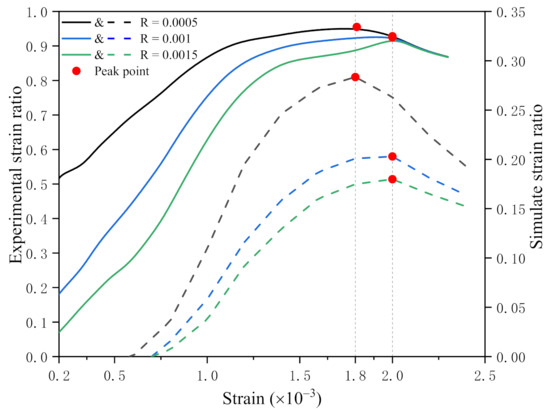 The strain ratio curve can reflect the crack development process of the specimen. According to the experimental strain ratio curve, when the strain is less than 0.0002, micro-cracks appear on the surface of the specimen. From the peak strain, the slope of the curve becomes smooth, which means the increasing rate of cracks slows down. The tendency is consistent with the real experimental crack development shown in Section 4.1.