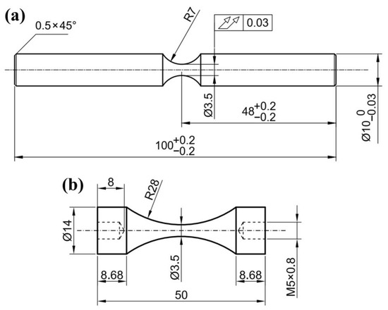 Specimen shapes and dimensions (mm) used in fatigue tests: (a) rotating bending; (b) ultrasonic axial loading.