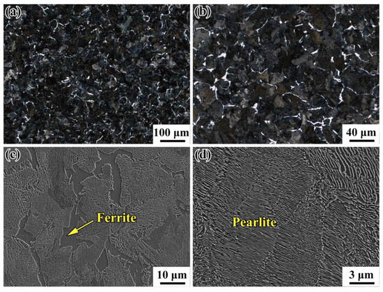 Microstructure of the wheel-steel: (a,b) OM (optical microscopy) images of pearlite domains (black regions) and proeutectoid ferrite domains (white regions); (c,d) the SEM (scanning electron microscopy) images.