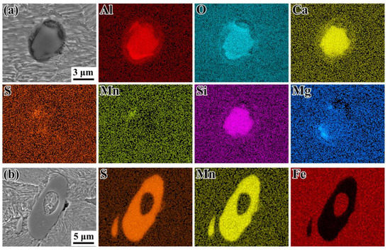 Figure 5 shows electron micrographs of representative compositions of the oxide inclusions and sulfide inclusions in the metallographic samples, which were measured by the automated SEM/EDX Aspex analysis. The representative oxide inclusions were mainly Al2O3, CaO, and SiO2 with spherical shapes, as shown in Figure 5a. The representative sulfide inclusions were almost MnS with elongated or ellipsoidal shapes, as shown in Figure 5b.