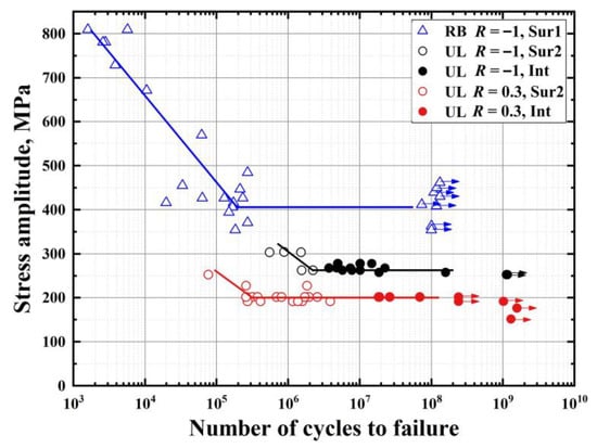 S-N curves of tested specimens under rotating bending and ultrasonic axial cycling with stress ratios of −1 and 0.3. (RB: rotating bending, UL: ultrasonic loading, Sur1: surface crack initiation without inclusion, Sur2: surface crack initiation with inclusion, Int: internal inclusion, symbol with arrow: not broken).