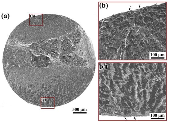 Surface slip-induced crack initiation under rotating bending loading, σa = 415 MPa, Nf = 1.72 × 105 cycles: (a) whole fracture surface, (b,c) details for crack initiation sites.