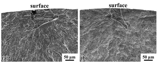 Typical fracture morphologies of surface crack initiation by ultrasonic fatigue test: (a) R = −1, σa = 263 MPa, Nf = 1.55 × 106 cycles; (b) R = 0.3, σa = 227 MPa, Nf = 1.83 × 106 cycles.