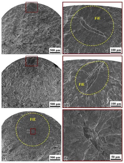 Typical fracture morphologies of internal crack initiation by ultrasonic fatigue test: (a) R = −1, σa = 262 MPa, Nf = 7.78 × 106 cycles; (c) R = −1, σa = 258 MPa, Nf = 1.01 × 107 cycles; (e) R = 0.3, σa = 202 MPa, Nf = 1.84 × 107 cycles; while magnified views of inclusions inducing final failure are shown in (b,d,f), respectively. FiE: “fish-eye” morphology.