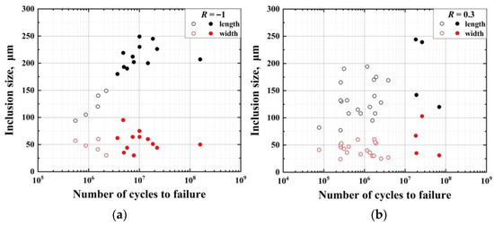 Relationship between inclusion size and fatigue life at (a) R = −1 and (b) R = 0.3. Hollow and solid symbols represent the locations of inclusion-inducing fatigue failure, hollow: surface; solid: interior.