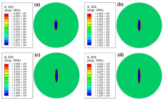 Stress distribution of the finite element models with different axial ratios (ARs) of elliptical MnS inclusion: (a) AR = 3, long axis of 170 μm; (b) AR = 4, long axis of 207 μm; (c) AR = 5, long axis of 240 μm; (d) AR = 6, long axis of 271 μm.