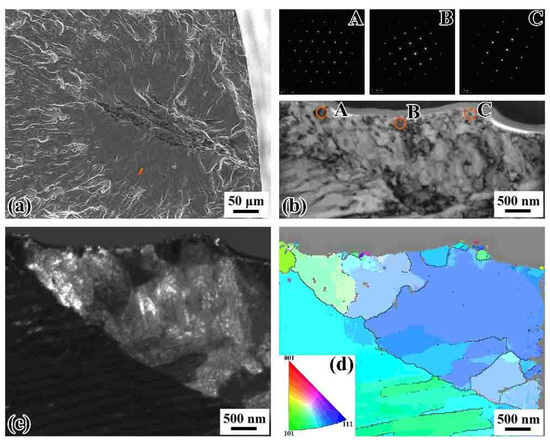 Figure 13 shows the fracture morphology of SEM image and microstructure of TEM bright- and dark-field images of the extracted longitudinal-section sample from the FiE area of the failed specimen under ultrasonic loading at R = −1. The specimen failed at σa = 258 MPa, Nf = 1.01 × 107 cycles, and R = −1. Figure 13b shows a detailed TEM morphology of the thin film, suggesting the original lamellar microstructure of pearlite. Moreover, the three SAD patterns at the selected circular domains composed of isolated spots indicate only one single grain within the SAD area. Note that the SAD patterns exhibit the microstructure just at local locations. The dark-field TEM image of Figure 13c shows the dispersed small bright humps along the fracture surface denoting the refined grains. It can be seen that the microstructure in the whole TEM sample was almost common lamellar pearlite. Figure 13d shows the TKD image of the sample. Some small grains were found on the fracture surface, indicating that grain refinement regions exist in the FiE area. The distribution of small grains is similar to the monotonic case of ductile fracture in some metallic materials [41].