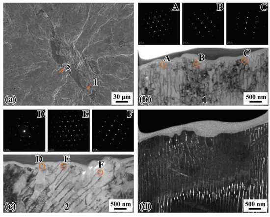 SEM and TEM images of extracted longitudinal-section samples cut along the loading direction for a specimen that failed at the cycles of 1.84 × 107 cycles under ultrasonic axial loading at R = 0.3: (a) SEM image of the longitudinal-section positions; (b,c) bright-field images of TEM samples 1 and 2, respectively; the labels A–F mark the SAD locations; (d) dark-field image of TEM sample 1.