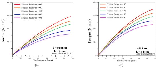 Correlation between torque of round die (M2 × 0.25) and displacement of stroke under different friction factors for outer diameter of micro round tube: (a) Ø1.9; (b) Ø1.94; (c) Ø2.