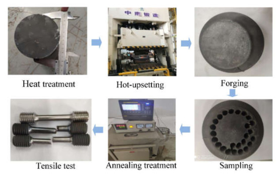 The microstructure of forgings determines their mechanical properties [33,34]. Uniform and fine grains are beneficial to the mechanical properties of forgings [35,36]. In the authors’ previous work [32], it was found that the double-stage annealing treatment is an effective way to eliminate the mixed grains of deformed GH4169 superalloy, but there are few studies on the improvement of mechanical properties during the double-stage annealing treatment up to now. Moreover, to simplify the experimental process, the small-size sample (ϕ10 mm × 15 mm) deformed on a Gleeble-3500 is selected as the study object in the author’s previous study [32]. Due to the volume effect of metal components, the obtained optimized annealing parameters can only provide a reference on the design of double-stage annealing treatments for large forgings. Hence, this study takes the large size samples (ϕ100 mm × 140 mm) after hot-upsetting as research objects and aims to investigate the optimized annealing parameters for improving the mechanical properties of hot-upsetting samples. The samples of GH4169 superalloy were forged firstly and then annealed by diverse annealing treatments. After that, for these annealed samples, the tensile test was implemented, and the fracture mode of GH4169 superalloy was also investigated.