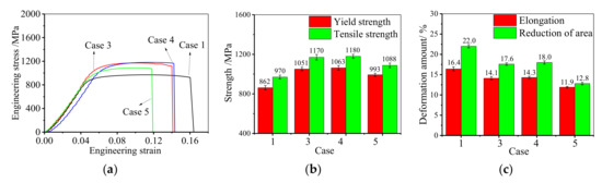 Figure 3 shows the influence of the FSA time on mechanical properties. From Figure 3a, it can be found that there is no obvious elastic-plastic transition period, which is consistent with the normal behavior reported in References [42,43,44]. Thus, the offset yield strength corresponding to 0.2% plastic strain (called yield strength) is used. In the plastic deformation period, because of the continuous proliferation, accumulation and interaction of dislocation, the strain hardening effect of GH4169 superalloy becomes obvious. Compared to the hot-upsetting sample, the strain hardening of the annealed samples is stronger. Figure 3b illustrates the effect of FSA time on the strength of GH4169 superalloy. Compared to the hot-upsetting sample (case 1), the strength of the annealed samples (cases 3, 4, and 5) significantly increases. This is attributed to the three main strengthening mechanisms for Ni-based superalloy [45]: (a) solid solution strengthening (the local nonuniformity in the lattice resulted from the solute atoms (i.e., alloying element) makes plastic deformation more difficult by impeding dislocation motion through stress fields [46]); (b) precipitation strengthening (the precipitation strengthening comes out when the second phase hinders the movement of dislocations to harden the materials [47]); (c) grain-boundary strengthening, i.e., fine-grain strengthening (the grain boundaries also act as pinning points impeding further dislocation propagation to increase the strength [48]). On the one hand, there are more recrystallized grains in the annealed samples, which increases the number of grain boundaries. During tensile deformation, the resistance to slip is larger, and then the strength improves. On the other hand, there are some δ phases in the sample, and it results in a decrease in the fraction of strengthening γ′′ phase after the strengthening heat treatment [49]. Compared to the hot-upsetting sample (case 1), the fraction of δ phase for annealed samples (cases 3, 4, and 5) is larger. It means that the precipitation strengthening is weaker. However, the strength of the annealed samples is larger than that of the hot-upsetting sample. This illustrates that the strength of the studied alloy after annealing greatly increases because the fine-grain strengthening plays a leading role in the combined effect of fine-grain strengthening and precipitation strengthening.
