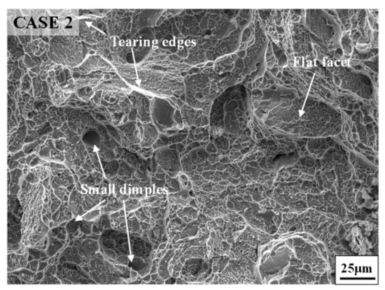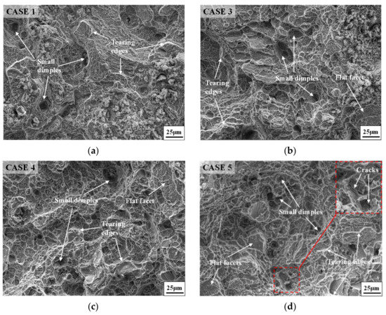 Figure 4 shows the fracture morphologies of annealed samples with different FSA times and the hot-upsetting sample. Obviously, the fracture morphologies of annealed samples with different FSA times and the hot-upsetting sample have the same characteristics. It can be observed that lots of tearing edges generate at the fracture surface, and many small dimples distribute inside the fracture surface. Generally, the large dimension of dimple reflects the high plasticity of material, and large numbers of dimples and tearing edges represent the occurrence of shear fracture [50,51]. This indicates that the high-temperature fracture modes of annealed samples with different FSA times and the hot-upsetting sample are the shear fracture. Moreover, for annealed samples with different FSA times, there are a few flat facets (i.e., cleavage planes) in which some small tearing edges locate compared to Figure 4a, as shown in Figure 4b–d. This illustrates that the high-temperature fracture modes of annealed samples with different FSA times contain quasi-cleavage fracture [52,53]. Therefore, for annealed samples with different FSA times, the high-temperature fracture mode is a mixture of shear fracture and quasi-cleavage fracture. The occurrence of quasi-cleavage fracture leads to the reduction of plasticity [54,55], so the elongation of annealed sample is decreased. However, owing to the appearance of many dimples and some cleavage planes, the fracture mode presents a ductile fracture macroscopically. Furthermore, from Figure 4d, it is also found that some small cracks come out, resulting in the occurrence of fracture and reduction of plasticity. This phenomenon is responsible for the small drop of elongation for case 5.