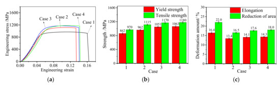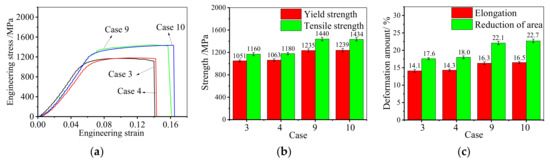The comparisons of mechanical properties at room temperature and high temperature are shown in Figure 7. From Figure 7a, apparently, the strength of the studied alloy at the room-temperature tensile test is larger than that at the high-temperature tensile test. Both the strengths of the annealed samples at room temperature and high temperature have been significantly improved compared with that of the hot-upsetting sample. This indicates that adopting a suitable double-stage annealing treatment after deformation is an effective way to improve the strength of deformed GH4169 superalloy. The comparisons of the strength and elongation to fracture at room temperature and high temperature are illustrated in Figure 7b,c. It can be observed that the strength and elongation to fracture of cases 3 and 4 are similar, so do cases 9 and 10. This is because the deformed samples that undergo the double-stage annealing treatments of 900 °C × 9–12 h(water cooling) + 980 °C × 60 min(water cooling) have the similar microstructure. Therefore, the effects of fine-grain strengthening and precipitation strengthening are similar. Furthermore, it is noteworthy that the strength and the elongation at room temperature are larger than that at high temperature. This is attributed to the softening of grain boundary and the efficient movement of dislocations during high-temperature deformation. On the one hand, the softening of grain boundary weakens the resistance capability of grain boundary on dislocation slip [50]. On the other hand, the nucleation of microvoids on the δ phase is easier to take place due to the quick movement of dislocations [19]. Hence, both the strength and elongation at high temperature are smaller than that at room temperature.