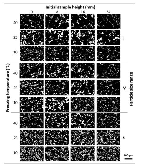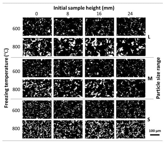 Sintered samples were denoted as X/YY/ZZZ according to the particle size range (X: L, M, or S), the freezing temperature (YY: 10, 25, or 40 °C), and the sintering temperature (ZZZ: 600 or 800 °C). For example, the L/25/600 sample was fabricated with the L (large particle size range), cooled at 25 °C, and sintered at 600 °C.