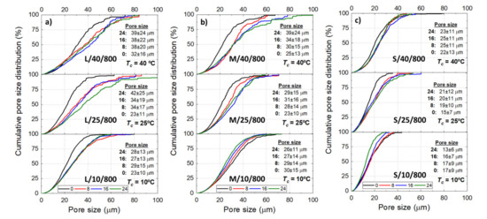 Cumulative pore size distribution of the Ni wick sintered at 800 ℃ according to the initial sample height (= 0, 8, 16, and 24 ), freezing temperature ( = 40, 25, and 10 °C), and de particle size range L (a), M (b), and S (c). Tables inserted show the average pore size () at the respective .