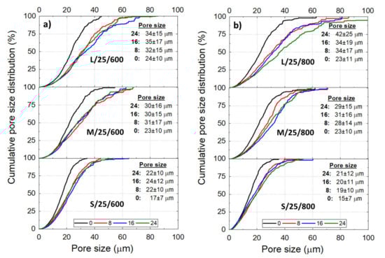 = 0, 8, 16, and 24 ), particle size range (L, M, and S), and the sintering 600 (a) and 800 °C (b). Tables inserted show the average pore size () at the respective .