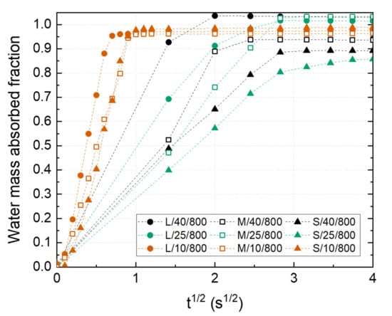Figure 6 shows the water mass absorbed fraction of the fabricated Ni wicks. A minimum fraction of 0.85 of the total volume was filled during the test in all samples because of the tortuosity of the interconnected porosity (Figure 2), where pore branching and pore section variations impede the liquid transportation. It should be noticed how samples L/40/800, M/40/800, and L/25/800 reach a plate value above 1, which could be attributed to the extra amount of water retained at the wick surfaces, especially those not in contact with the liquid reservoir. This situation was observed in the wicks with bigger pore sizes feeling wet after the capillarity test. Ni wicks freeze-casted at 10 °C have shown a higher mass absorption rate. The presence of small pore size and high pore interconnectivity promoted by the higher applied are responsible for this behavior. Similar results were reported elsewhere [17]. Wicks labeled as S/40/800 and S/10/800 showed the lowest water mass absorbed fraction and rate, attributing to the low reached leading to minor open porosity since they exhibited similar pore sizes compared with L/10/800 and M/10/800 Ni wick. These results indicated the importance of achieving a high tortuosity pore structure with a small pore size during wick manufacturing to promoted high absorption rates.