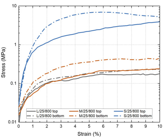 Uniaxial compression strength tests of the L/25/800, M/25/800, and S/25/800 samples were carried out at room temperature using a universal mechanical testing machine (AG-IS, Shimadzu, Grossenbaum, Germany) with a 10 KN load cell and a crosshead speed of 2 . Tests were performed on three cylindrical samples of 8 mm in diameter and 4 in height which were cut from the sintered samples at the bottom ( = 5.5 ) and top ( = 16.5 ) sections. All tests were stopped when a constant plateau on the applied stress is achieved.