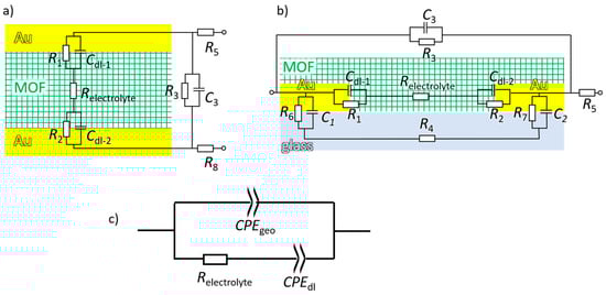 For various ionic conductor systems, appropriate equivalent circuits have been discussed and justified [31,32,33,34]. Appropriate equivalent circuits where each component has a clear physical meaning have also been introduced for various nanoporous systems. Examples are MOF films with (low) electronic conductivity on substrates with interdigitated gold electrodes (IDEs) [35], zeolite-Cr2O3 films on IDEs used as gas sensors [36,37], zeolites embedded in polymer membranes [38], zeolite films as coatings on alloys [39], or for the film growth of a zeolite membrane [40]. To the best of our knowledge, a critical discussion of an equivalent circuit for the ionic conduction in nanoporous non-conducting materials, like (most) MOFs between two inert electrodes like gold is missing.