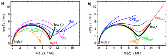 For a better understanding of the parameters, the effects of the individual parameters are discussed. The complex plane plots of the impedance, also referred to as Nyquist plots, are shown for typical values in Figure 2. In the Nyquist plots, the shape is a characteristic semi-circle in the high-frequency range and a straight line in the low-frequency range. For ndl = 1 (red spectrum in Figure 2a), the low-frequency line is vertical in the Nyquist plot (usually at Re(Z) = R). With decreasing values of ndl, the low-frequency line becomes less steep and the branch becomes larger (i.e., the impedance of the CPEdl element becomes larger). The high-frequency semi-circle has a diameter of R. For decreasing ngeo, the semi-circle is flattened (green spectrum). It should be noted that for ngeo = 1 and ndl = 0.5, the semi-circle is perfectly round, and the low-frequency spike has an angle of 45° in the Nyquist plot, just like the Randles circuit, however, the physical meaning of the components are different, see above.