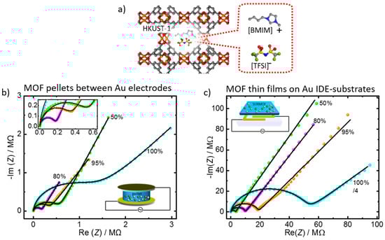 The equivalent circuit is applied to the conduction of ionic liquids in MOF materials, in the form of pellets and thin films—Figure 3. In detail, MOFs of type HKUST-1 filled with various loadings of IL of type [BMIM][TFSI] are studied. Figure 3b shows the ionic conduction in MOFs in the form of pellets, and Figure 3c shows the ionic conduction in a MOF film grown on a substrate with deposited (IDE) electrodes. In both cases, the characteristic semi-circle at high frequencies and the straight line at low frequencies are clearly visible. The experimental data can be well described by the suggested equivalent circuit.