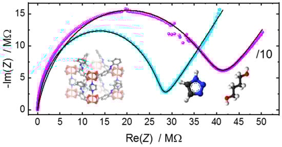 For proton-conducting materials, there is also no charge transfer between the electrode and the electrolyte, i.e., through the electrode-electrolyte interface. Thus, the suggested equivalent circuit can also be applied. In Figure 4, the Nyquist plots measured for two different proton-conducting molecules, that are 1,2,3-triazole and 1,4-butanediol, in the pores of a MOF thin film are shown. The data can be described well with the (R-CPEdl)‖CPEgeo equivalent circuit.