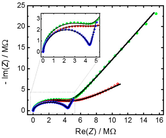 Nyquist plots of IL in HKUST-1 SURMOF films on substrate functionalized with MUD-SAM (green) MHDA-SAM (red) and with UV-ozone for 30 min (blue)—see Figure 5. The experimental data are shown as spheres, the grey-dotted lines are the fits with the (R-CPEdl)‖CPEgeo. The black-color-dashed lines are the best fits by Randles equivalent circuit. The frequency range in panel (a) is 3.5 Hz to 5 MHz, and in panel (b) is 56 Hz to 5 MHz. Only the plotted data are used for the fitting by the models. Like in Figure A2 and Figure A3, the major reason for the poor description of the experimental data by the Randles circuit is the fact that the Warburg resistance of the Randles equivalent circuit results in a low-frequency ray with an angle of 45° in the Nyquist plots, which is often not the case in the experimental data. This results in poor fits, especially when the low-frequency range is recorded, see panel (a).