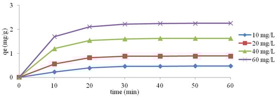 The efficiency of ion exchange depending on the reaction time and initial concentration of ammonium ions is shown in Figure 1. As illustrated in Figure 1, the removal rate of ammonium ions increases in the initial 20 min, then gradually equalises and finally reaches equilibrium after 40 min. Changes in the NH4+ removal rate in the initial phase of the process may result from many free active adsorbent sites. Then the removal rate of ammonium ions decreases. On the other hand, an increase in the ion exchange efficiency with an increasing initial NH4+ ion concentration may result from an increase in the driving force, which is measured by the concentration of the solution, especially in the initial stage of the process, where there is a large difference in the concentration of the ammonium ion [39,40,41,42,43].