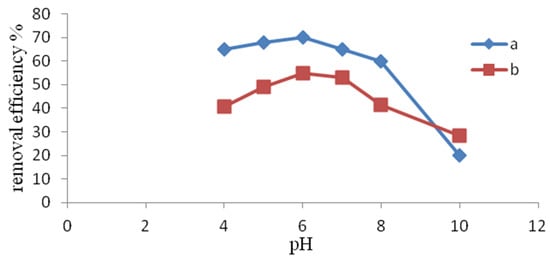 Influence of pH on the efficiency of NH4+ removal from (a) distilled water, (b) tap water.