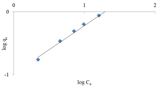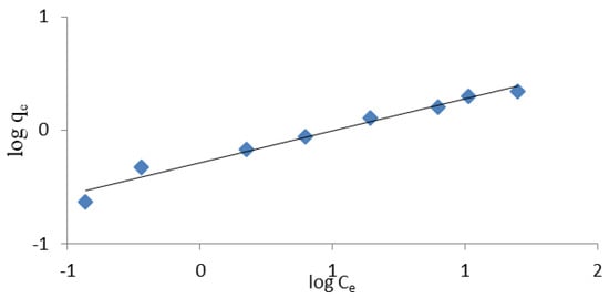 Freundlich’s isotherm is commonly used to characterise adsorption properties on heterogeneous surfaces. Freundlich’s equation usually takes the form of = KCe 1/n ( is the quantity of NH4+ absorbed per unit mass of adsorbent), Ce is the equilibrium concentration of NH4+ residual in solution, n and K are both empirical constants. The linear form of the equation is shown in Equation (2): [35,39]
