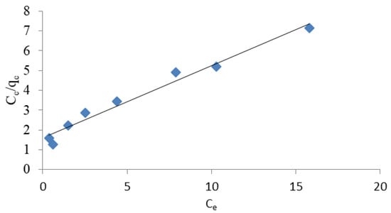 The Langmuir equation describes a case where only one adsorption layer is formed on the adsorbent surface. The Langmuir theory presumes that the adsorbent surface is homogeneous, and the possibility of creating multiple layers is excluded. A particle cannot move freely on the surface, and the lateral interactions between the particles are irrelevant [45,46,47]. The Langmuir equation in linear form is shown in Equation (3) [39]: