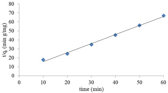 The linear form for the pseudo second-order equation is described as follows in Equation (5) [43]: