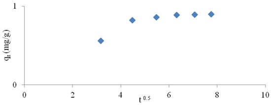 According to the intramolecular diffusion model, as shown in Figure 8, the ammonium exchange involves two stages (linear regions); this suggests that the process may be conducted by surface sorption and intramolecular diffusion [45]. Karadag et al. [43] have stated that the first linear part reflects the diffusion effect in the boundary layer, and the last linear part may be due to the intramolecular diffusion effect.