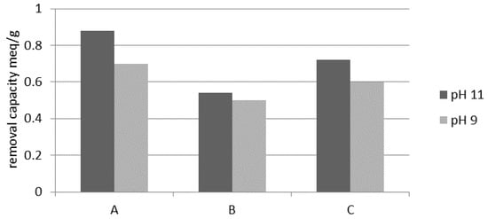 The influence of pH in the studied range of 4–10 on the change in ammonium ion removal efficiency is shown in Figure 2. The highest reduction of NH4+ removal was obtained at a pH of 6. A slightly smaller effect was observed at pH 7. Similar properties were shown in clinoptilolite studied by Du et al. [35]. However, in these authors’ studies, a substantial decrease in the efficiency of the process was already noted at a pH of 7. The influence of the reaction on the efficiency of NH4+ ion removal is mainly related to the pH-dependent form of ammonium nitrogen. At a pH above 9, the NH4+ ions change into the gaseous form of NH3, which do not undergo ion exchange when deprived of charge. A drop in pH below 6 increases the concentration of H+ ions, which become competitive with NH4+ ions [41].