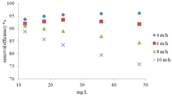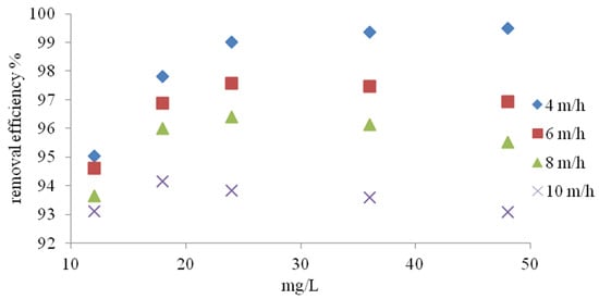 Under flow conditions, the ion exchange efficiency was investigated depending on the filtration speed and initial concentration of ammonium ions. According to the studies presented in Figure 10, the efficiency of NH4+ ion removal depends on both the filtration speed and the initial concentration. In the case of filtration at a speed of 4 m/h, the effect of ammonium ion removal increased with the initial concentration, reaching 95.04% at 12 mg NH4+/L and 99.5% at 48 mg NH4+/L. During filtration at a speed of 6 and 8 m/h, the highest effect of NH4+ removal was obtained for the concentration of 24 mg NH4+/L. A decrease in process efficiency at higher ammonium ion concentrations was observed in both cases. At a filtration speed of 10 m/h, the maximum process efficiency was obtained with an initial concentration of 18 mg NH4+/L. Higher process efficiencies in the range of lower filtration rates are directly related to the retention time, which was also shown by Du et al. [35]. The results of tests using tap water are presented in Figure 11. At a filtration speed of 4 m/h, the process efficiency increased with the increase in initial NH4+ concentration from 93.1% to 96.1%. In the second case (filtration speed 6 m/h), the highest removal effect of 93.51% was obtained at the initial concentration of 24 mg NH4+/L. At the concentration of 48 mg NH4+/L, the process efficiency was lower and amounted to 91.8%. For the remaining filtration speeds, the effect of NH4+ ion removal decreased with increasing initial concentrations from 91.13% to 84.4% at 7 m/h and from 88.8 to 75.8% at 10 m/h. The decrease in ammonium ion removal efficiency in prepared tap water is mainly related to the presence of calcium and magnesium ions, which was confirmed by Transcarpathian clinoptilolite studies performed by Sprynskyy et al. [7] and Wang et al. [47]. Mazloomi et al. [40] showed the following ion exchange sequence (K > Na > Ca > Mg) for Iranian zeolites.