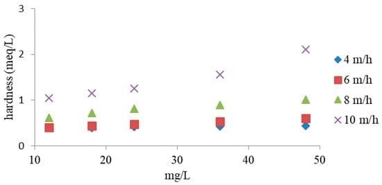 The relationship between the removal of Ca2+ and Mg2+ and NH4+ ions depending on the filtration rate is shown in Figure 12. According to the study, the removal efficiency of Ca2+ and Mg2+ decreased with the increasing filtration rate and initial NH4+ concentration. The obtained relationships indicate that weathered halloysite has a higher efficiency in removing ammonium ions than those causing water hardness at higher filtration speeds and higher initial NH4+ concentrations.