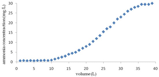 Figure 13 shows the exhaustion curve of an ion exchange column packed with a weathered halloysite at a flow rate of 6 m/h and an initial ammonium ion concentration of 30 mg NH4+/L. It was found that the total ion exchange capacity of the weathered halloysite obtained under dynamic conditions was 20 mg/g. The breakthrough of the halloysite bed was observed after passing 10 L of model water. The calculated ion exchange capacity was 5.0 mg/g. Du et al [35] determined that the CEC of clinoptilolite after reaching a concentration of 5 mg N-NH4+/L with an initial value of 25 mg N- NH4+/L, to be 7.74, 6.95 and 5.81 mg/g for flow rates of 6, 12 and 24 BV/h, respectively.