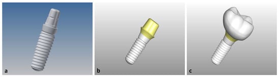 (a) Implant after manual entry of the geometries in the software Inventor; (b) imported mesostructure in the Freeform software on the before constructed implant; (c) Representation of the suprastructure constructed on the mesostructure.