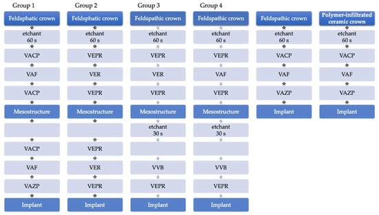 The intaglio surfaces of the suprastructures and monolithic restorations were acid-etched for 60 s with hydrofluoric acid (VITA Adiva Etch, VITA), cleaned with oil-free water-spray, ultrasonically rinsed in 40 mL distilled water (Transsonic T310, Elma Schmidbauer, Singen, Germany), and dried with oil-free air. All specimens were produced successively, one after the other. Pre-treatment of abutments and meso- and suprastructures, as well as cementation of the monolithic restorations, was performed according to the test matrix presented in Figure 2, following the manufacturers’ instructions by the same operator (SM). When an adhesive composite was used, the first 0.5 cm of the material was discarded.