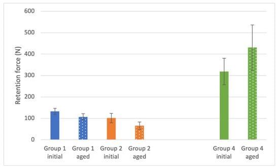 Initial retention forces of Group 1 (132.9 ± 14.1 N) and Group 2 (101.4 ± 22.2 N) did not differ significantly from each other. However, a significant difference was found for both groups when compared to the result of Group 4 (319.0 ± 61.8 N) (Table 2 and Table A1, Figure 4).