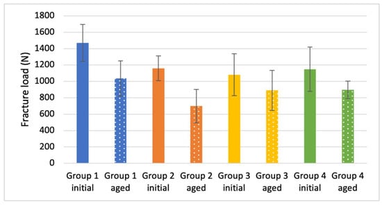 The initial fracture load values for Group 1 (1469.8 ± 224.5 N) were significantly higher than those for Group 2 (1159.6 ± 151.1 N), Group 3 (1081.8 ± 256.0 N), and Group 4 (1148.3 ± 269.5 N), which differed not significantly among each other (Table 3 and Table A2, Figure 5).