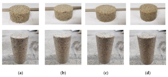 The specimens were manufactured via the following procedure: the coarse aggregates were combined depending on the mix ratio shown in Table 2 and blended for three minutes using a handheld mixer. In another container, the polyurethane resin and hardener were combined and blended for one minute. The blended polyurethane binder was poured into the container holding the blended coarse aggregates and mixed for another five minutes. The mixture was poured into a cylindrical concrete mold with a corresponding radius and height of 100 and 200 mm (ϕ100 × 200) and was then compacted. The cylindrical mold was demolded after being kept at room temperature for three days. Subsequently, the specimen was cured at room temperature for another seven days and was used for the compressive and water permeability tests. For the water permeability test, the test specimen was prepared by cutting the specimen into thirds horizontally. Figure 2 shows the appearance of the specimens fabricated for each formulation.