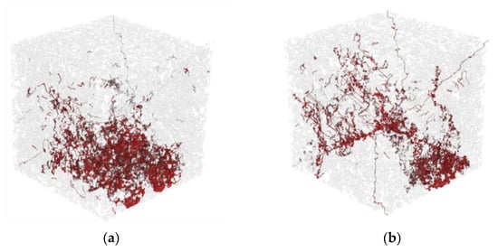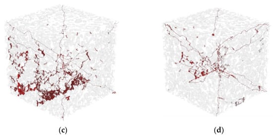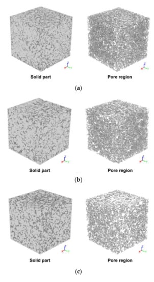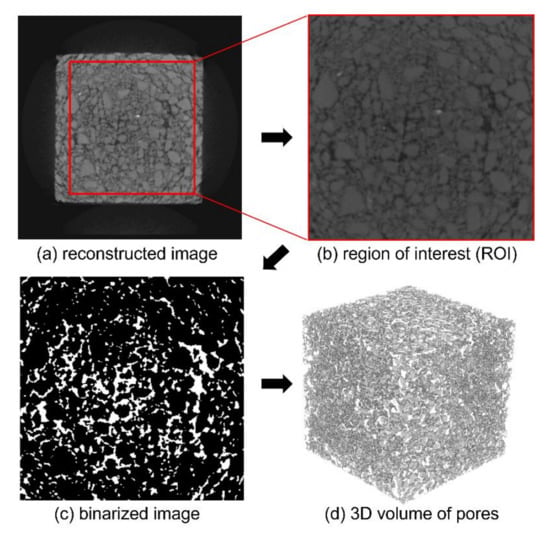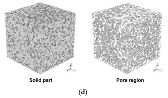 Given that the pore characteristics are the most critical when determining the properties of pervious materials, a binary image to describe the pore region was generated, as shown in Figure 4c. To segment the pore region from the original image, a proper threshold must be selected, and the modified Otsu method [] was used here. In the binary image, white represents the pores within the specimen. A 3D volumetric image of the pores can then be obtained by the subsequent staking of a series of binary images, as shown in Figure 4d. The 3D volume of pores was used to investigate the quantitative pore characteristics of the specimens, in this case the porosity; this measure can also be utilized to examine the material properties using a numerical approach. The porosity was computed as the number of pore voxels compared to the 3D volume of the specimen, and only pores larger than 146 μm according to the image resolution were considered in the porosity analysis.