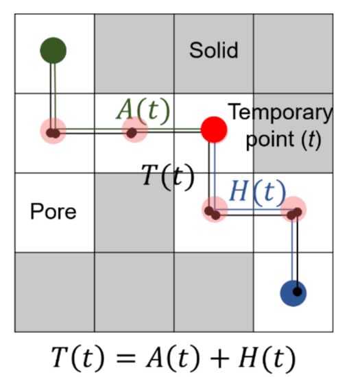 In Equation (1), denotes the actual distance between two end points of a pore channel considering obstacles, while is the shortest length between the two end points.