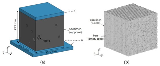 With the obtained micro-CT data, the mechanical behavior of the specimens was also numerically investigated. Figure 6a shows a schematic of the analysis configuration considered in this study. The geometric configuration was extracted from the CT examination and converted to the ABAQUS format. The specimen was made of polyurethane-based PPM and contained internal and external pores throughout. The specimen had a height, width, and length of 43.3 mm, as indicated in this figure. The specimen was placed on the support and vertical displacement was applied for the compression test. Herein, the support and displacement plate were omitted in the finite element model by applying the displacement to the surface of the specimen directly.