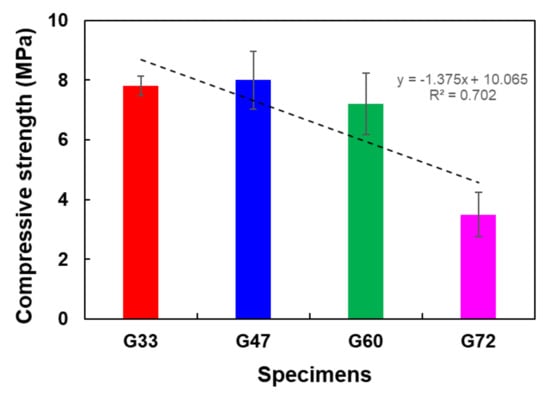 As presented in the micro-CT examination and in the finite element model, the volume and formation of pores in the specimens were varied and stress concentrations occurred around the pores. Specimen G70, which had the largest volume of pores in its material, was relatively vulnerable to compressive loading since stress was established and developed into a large stress concentration around the pores, which may have led to a failure of the material []. Meanwhile, specimens G33 and G47, which had relatively small volumes of pores in their materials, presented large compressive strength values. It should be noted that the volume of pores in the materials significantly influenced the compressive strength of the pervious concrete material [].